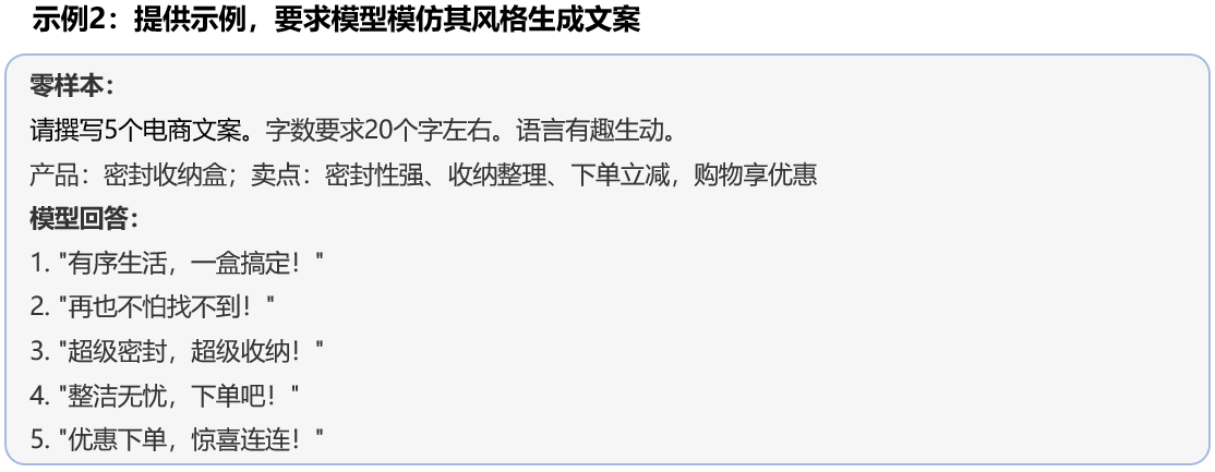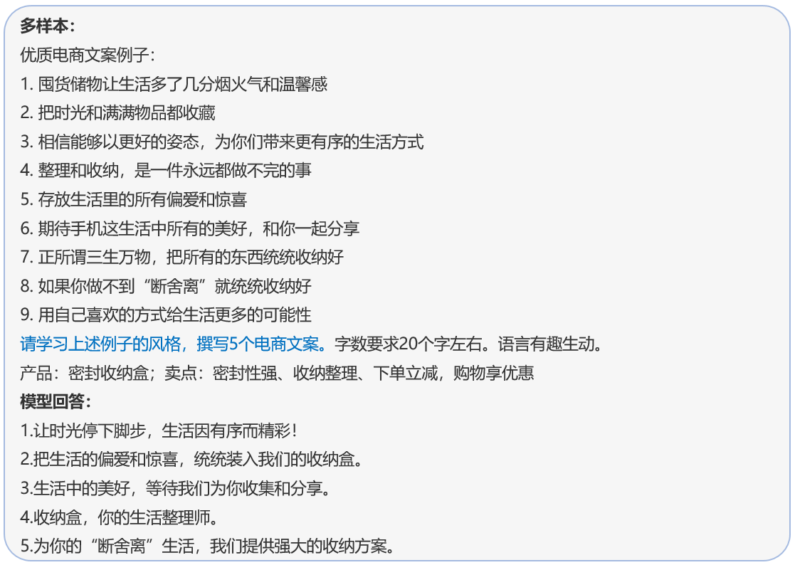 可以在提示词中提供示例,让模型先学习后回答,在使用这种方法时需要约束新样例不能照抄前面给的参考样例,新样例必须多样化、不能重复等,否则可能会直接嫁接前文样例的内容,也可以约束只是让它学习参考样例的xxx生成思路、xxx风格、xxx生成方法等。