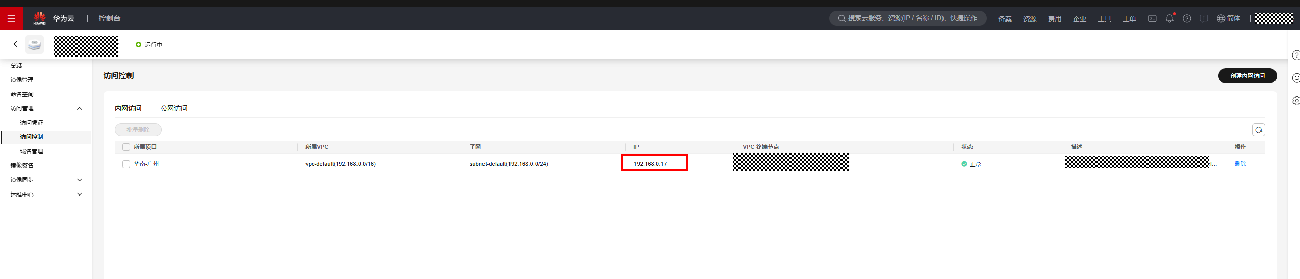 - 依次单击“访问管理->访问控制->内网访问”,找到所属VPC列的值为vpc-default的记录,记录IP列的值。