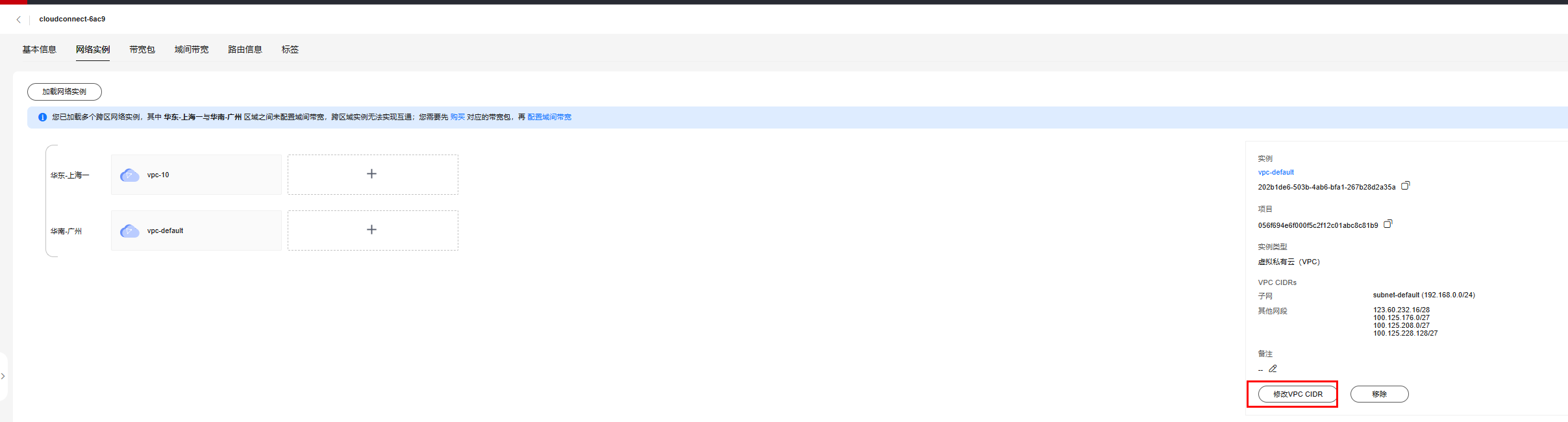 图标,区域选择华东-上海一。在左侧导航栏,选择“网络”>“云连接 CC”。单击步骤1创建的CC连接,进入网络实例页签,单击vpc-default下的“修改VPC CIDR”。