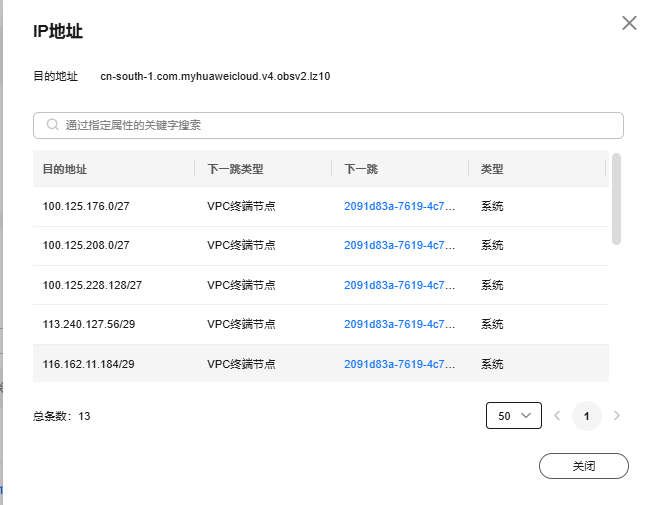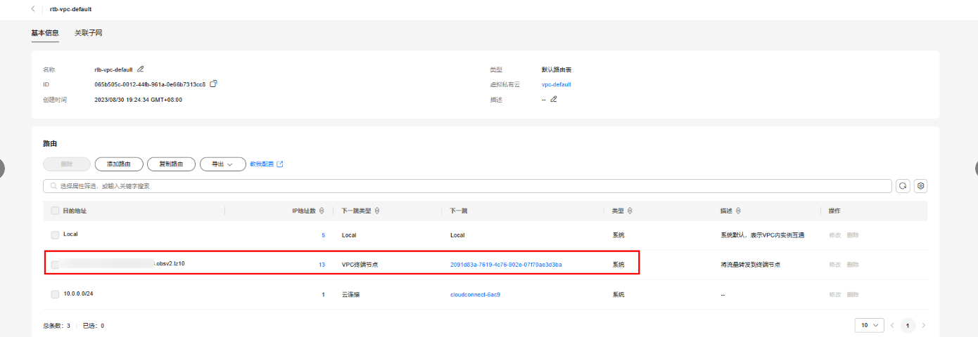 - 从vpc-default 路由表查看 VPCEP 访问OBS的路由信息。