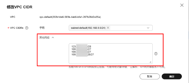 - 单击“其他网段”,把OBS的ip网段(即2中查询出来的)增加到其他网段中。