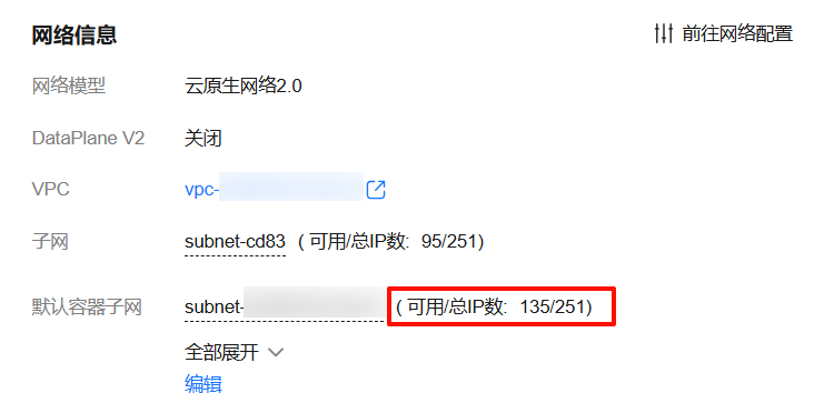 - 查看“网络信息”,确认您配置的默认容器子网信息,确认是否还有足够的IP。