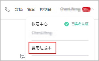 1. 登录华为云后,单击页面右上角的账号名称下拉框,选择“费用与成本”。