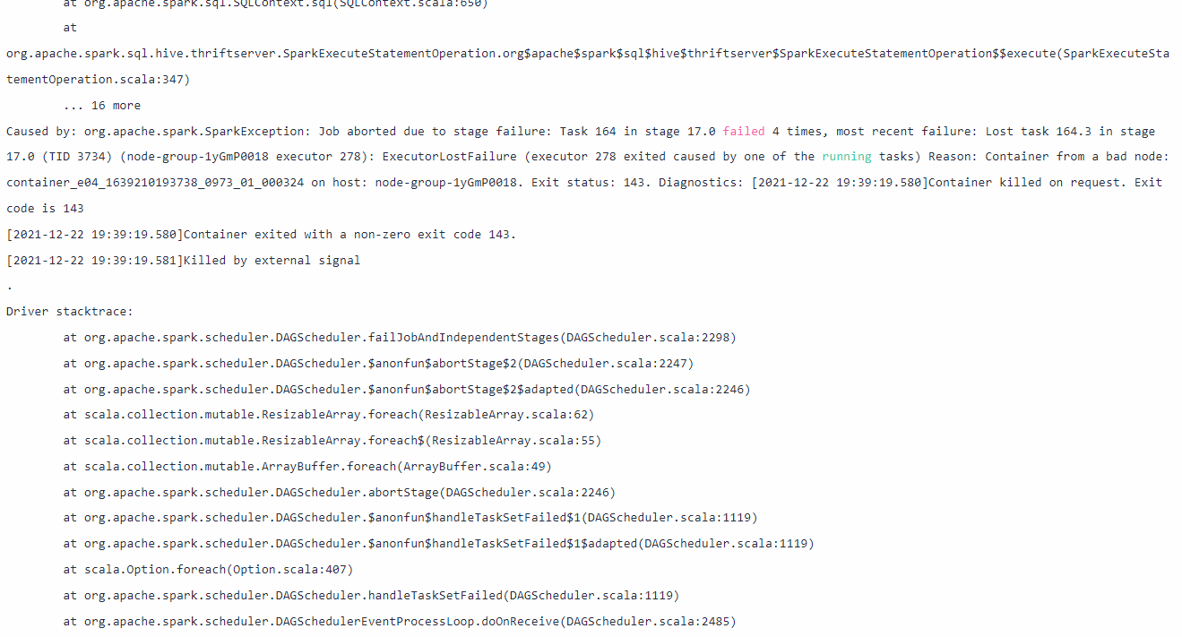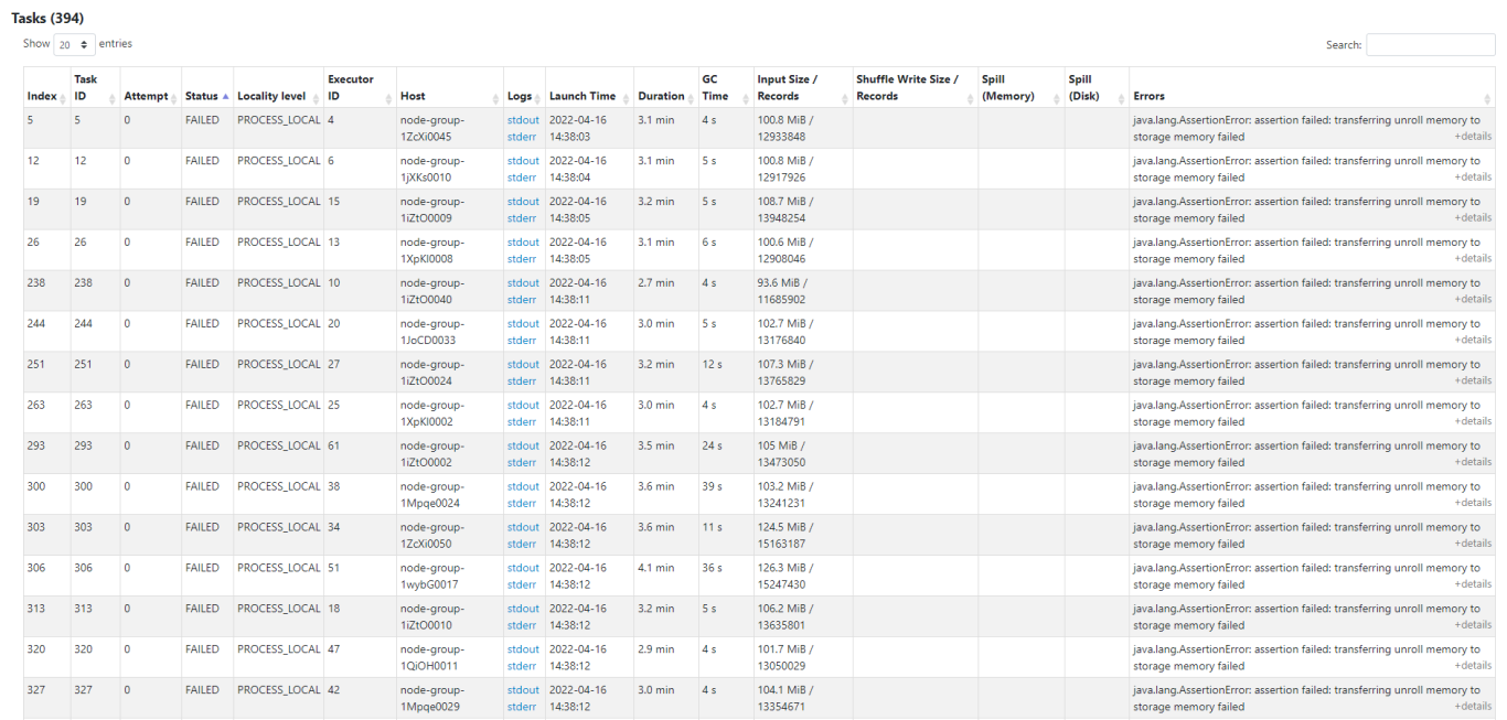 - 打开stage->查看fail状态的task,通过日志或者界面显示,可以看到失败原因,通常会是以下报错: