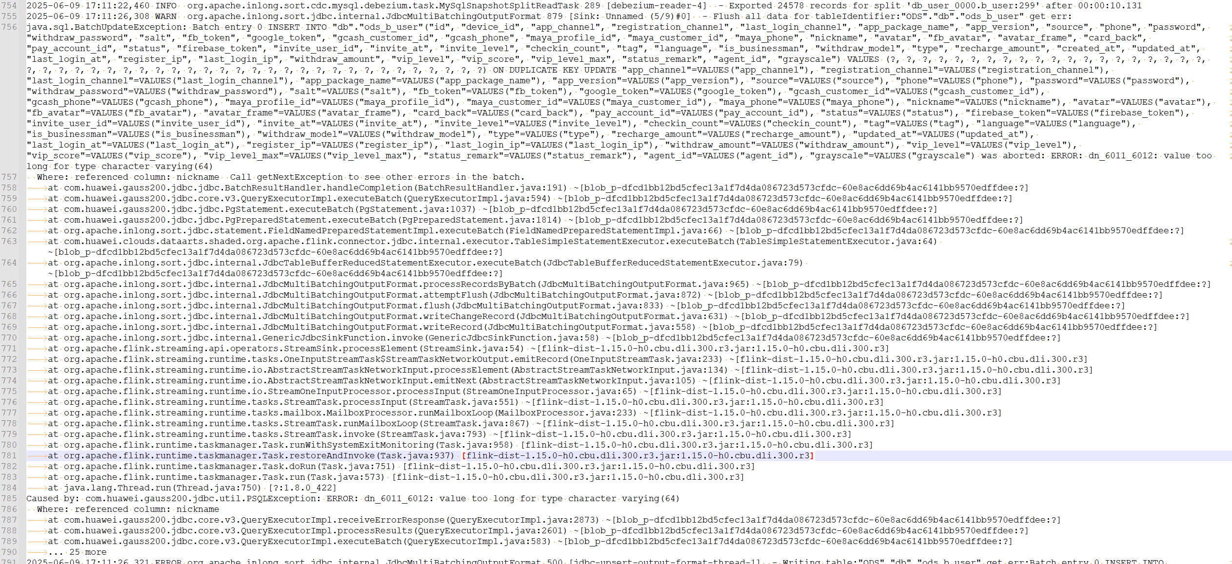 MySQL到DWS链路启动任务后,同步过程中异常,报错关键信息包含“value too long for type character varying”。