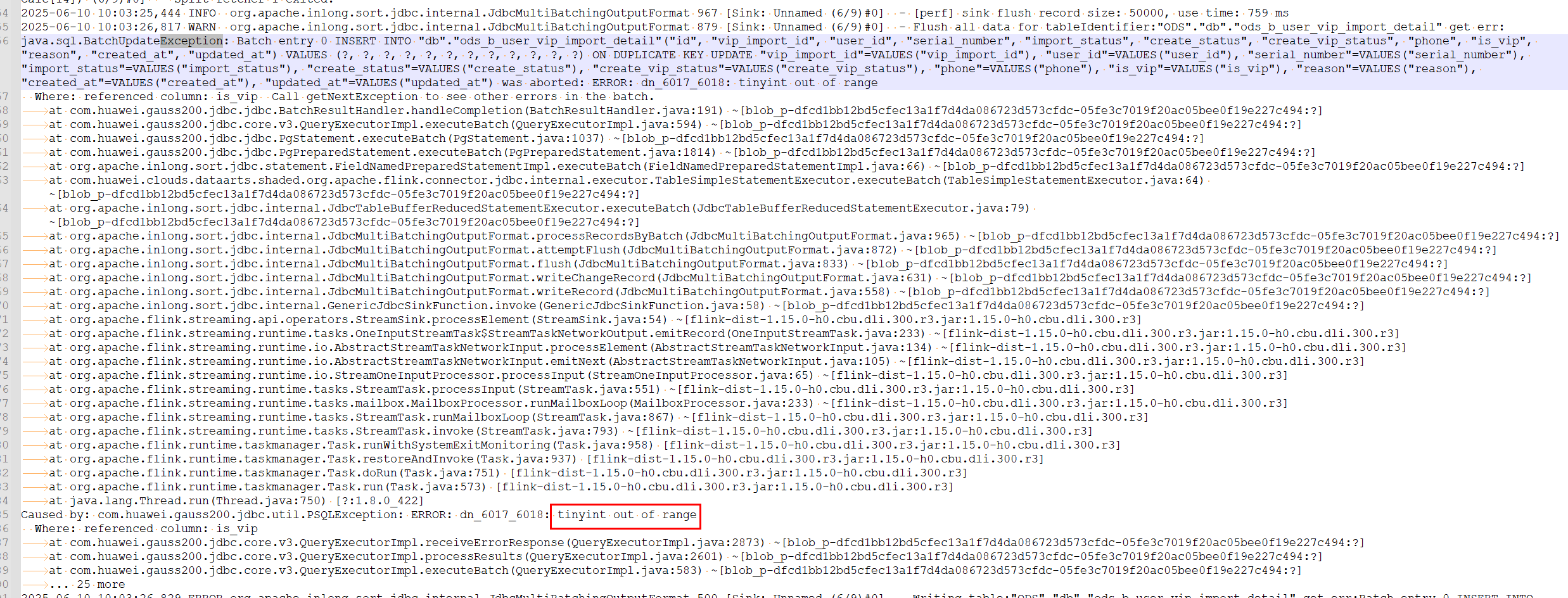 在MySQL到DWS的实时作业启动后,同步过程中异常,报错关键信息包含“tinyint out of range”。