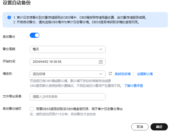 数据库安全审计支持手动和自动两种备份方式。备份日志后,审计日志将备份到对象存储服务上,并自动为您创建桶,桶按用量需要单独收费。