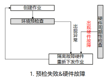 - 场景一:环境预检测失败、硬件检测出现故障,系统隔离所有故障节点并重新下发训练作业。