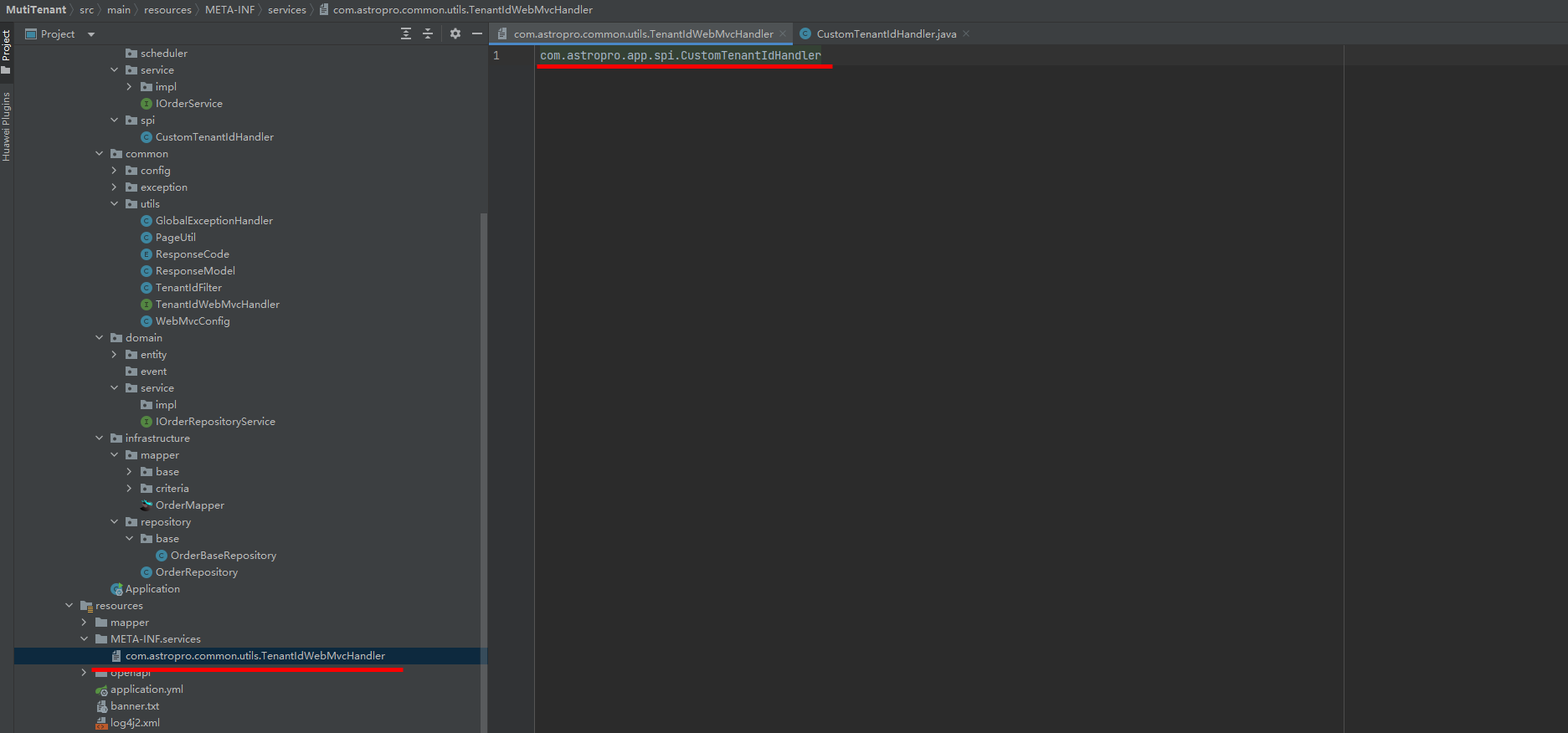 - 配置SPI(在resource/META-INF/services目录中新建文件,文件名为TenantIdWebMvcHandler全路径限定名,文件中内容为TenantIdWebMvcHandler接口实现类的全路径限定名)。