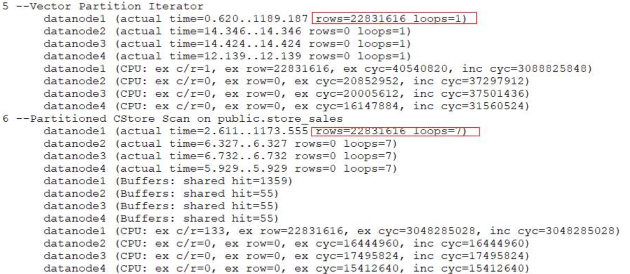 id | operation | A-time ----+--------------------------------------------+----------------------- 1 | -> Streaming (type: GATHER) | 10961.337 2 | -> HashAggregate | [10953.014,10953.705] 3 | -> HashAggregate | [10952.957,10953.632] 4 | -> Streaming(type: REDISTRIBUTE) | [10952.859,10953.502] 5 | -> HashAggregate | [10084.280,10947.139] 6 | -> Seq Scan on public.t | [4757.031,5201.168] Predicate Information (identified by plan id) ----------------------------------------------- 3 --HashAggregate Skew Agg Optimized by Statistic 4 --Streaming(type: REDISTRIBUTE) datanode1 (rows=17) datanode2 (rows=8) datanode3 (rows=8) datanode4 (rows=14)