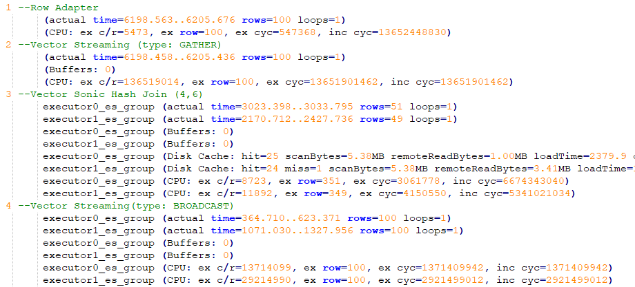 每个算子执行的过程都有CPU信息,其中cyc代表的是CPU的周期数,ex cyc表示的是当前算子的周期数,不包含其子节点;inc cyc是包含子节点的周期数;ex row是当前算子输出的数据行数;ex c/r则是ex cyc/ex row得到的每条数据所用的平均周期数。