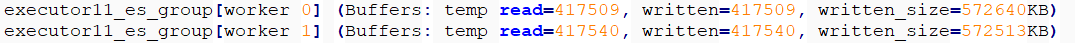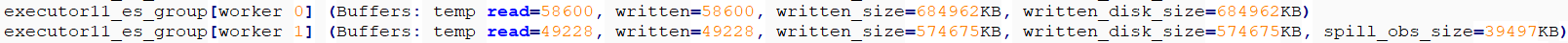 对于发生了下盘的算子,Buffer信息会展示下盘的数据量,“temp read”代表读取下盘的临时数据的次数,“written”代表写下盘的临时数据的次数,“written_size”代表下盘的数据量。