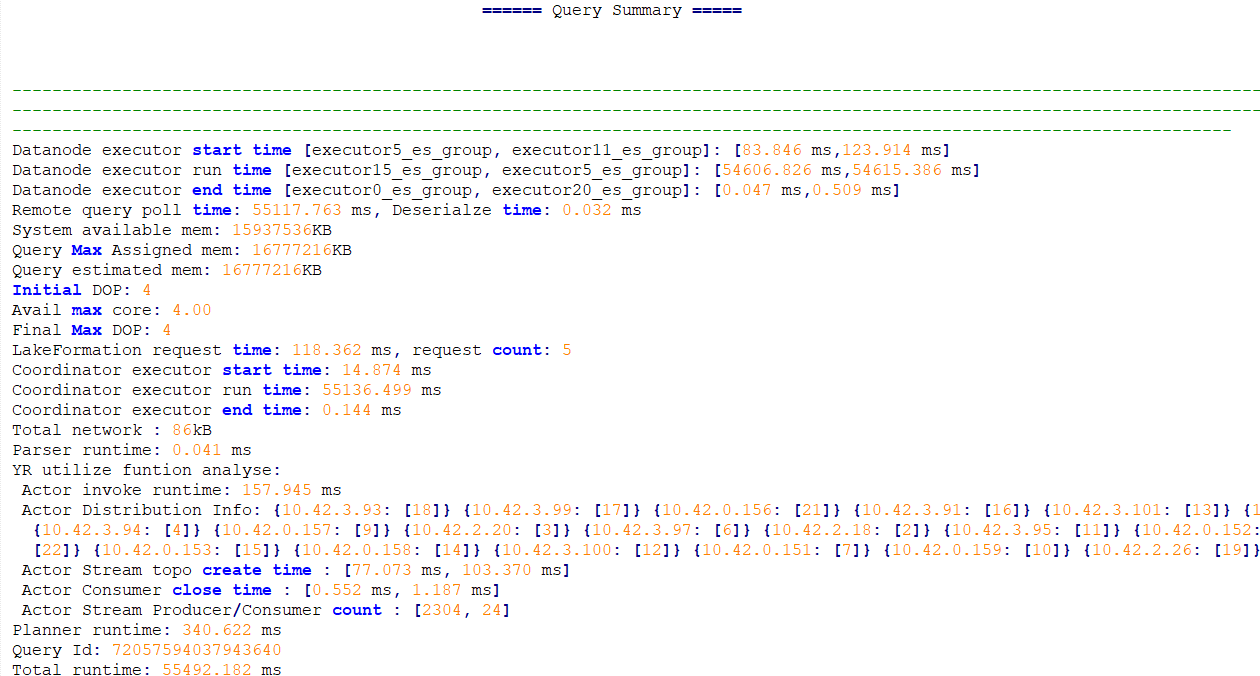 - DataNode executor run time:DN执行器运行时间,[min_node_name, max_node_name] : [min_time, max_time]。