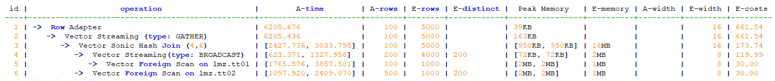 以表格的形式将计划显示出来,包含有11个字段,分别是:id、operation、A-time、A-rows、E-rows、E-distinct、Peak Memory、E-memory、A-width、E-width和E-costs。字段含义如下表1。