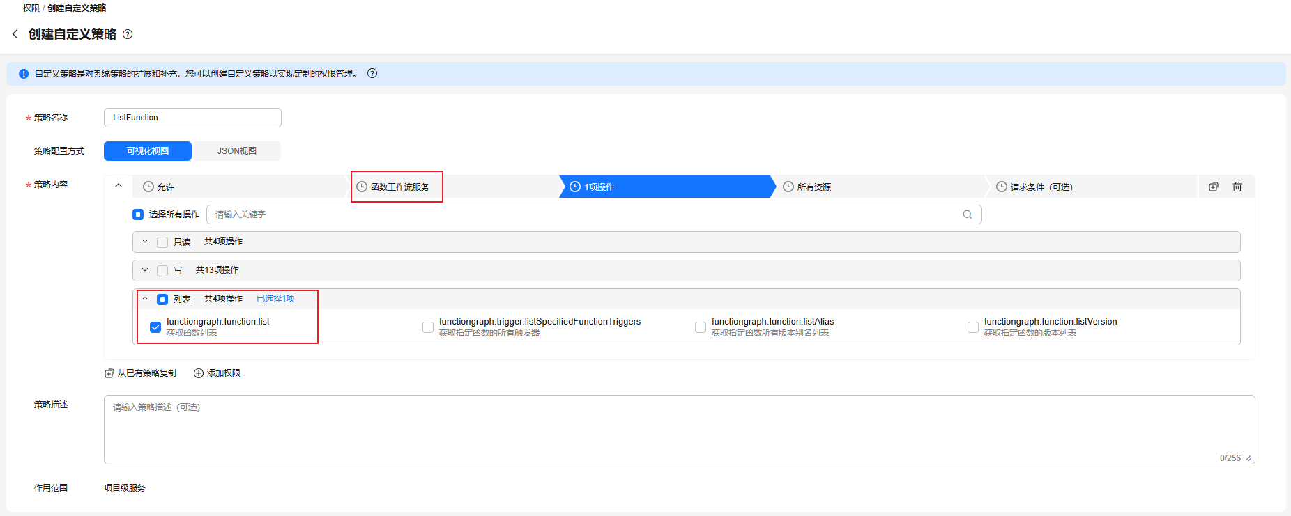 - 以配置“获取函数列表”接口的相关委托为例,如图1所示配置包含获取函数列表权限的自定义策略,单击“确定”完成自定义策略创建。