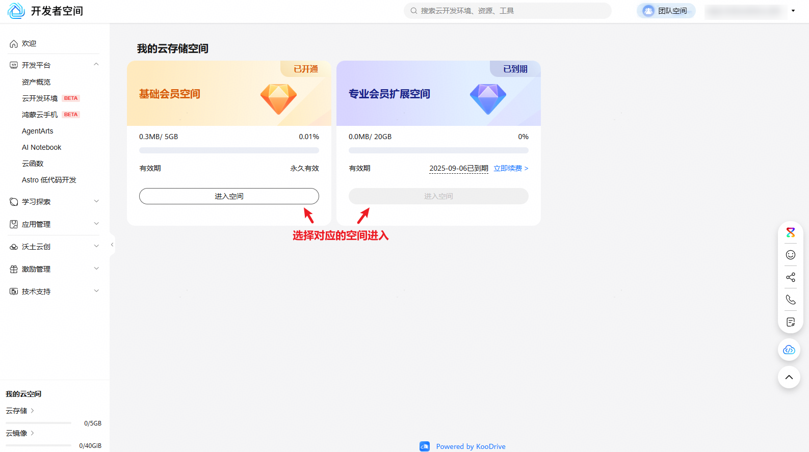 进入开发者空间云存储空间,有两种方式