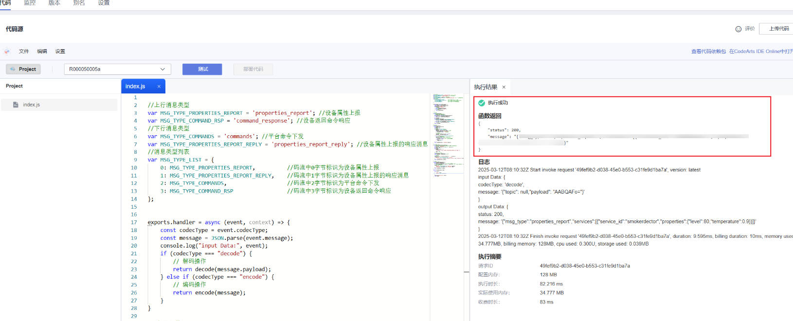 针对当前烟感产品实现的JavaScript样例如下,将代码复制到Project工程中。//上行消息类型 var MSG_TYPE_PROPERTIES_REPORT = 'properties_report'; //设备属性上报 var MSG_TYPE_COMMAND_RSP = 'command_response'; //设备返回命令响应 //下行消息类型 var MSG_TYPE_COMMANDS = 'commands'; //平台命令下发 var MSG_TYPE_PROPERTIES_REPORT_REPLY = 'properties_report_reply'; //设备属性上报的响应消息 //消息类型列表 var MSG_TYPE_LIST = { 0: MSG_TYPE_PROPERTIES_REPORT, //码流中0字节标识为设备属性上报 1: MSG_TYPE_PROPERTIES_REPORT_REPLY, //码流中1字节标识为设备属性上报的响应消息 2: MSG_TYPE_COMMANDS, //码流中2字节标识为平台命令下发 3: MSG_TYPE_COMMAND_RSP //码流中3字节标识为设备返回命令响应 }; // FunctionGraph入口函数 exports.handler = async (event, context) => { const codecType = event.codecType; const message = JSON.parse(event.message); console.log("input Data:", event); if (codecType === "decode") { // 解码操作 return decode(message.payload); } else if (codecType === "encode") { // 编码操作 return encode(message); } } /* 示例:烟感设备上报属性和回复命令响应时,携带的是二进制码流,通过javascript脚本将二进制码流数据解码为符合产品模型定义的json格式数据 传入参数: payload:[0x00, 0x00, 0x50, 0x00, 0x5a] 其中payload[0]代表数据类型,0x00代表属性上报;payload[1]与payload[2]代表属性level的值;payload[3]与payload[4]代表属性temperature的值,payload[3]为小数点前的值,payload[4]为小数点后的值。 输出结果: {"msg_type":"properties_report","services":[{"service_id":"smokedetector","properties":{"level":80,"temperature":90}}]} 传入参数: payload: [0x03, 0x01, 0x00, 0x00, 0x01] 其中payload[0]代表数据类型,0x03代表设备返回命令响应;payload[1]表示request_id的值,用于标识是否为某一条信息;payload[2]与代表命令设置是否成功,为0则成功;payload[3]与payload[4]代表命令响应"value"的值。 输出结果: {"msg_type":"command_response","request_id":1,"result_code":0,"paras":{"value":1}} */ function decode(payload) { // 这里可以实现具体的解码逻辑 var binaryString = atob(payload); const byteArray = new Uint8Array(binaryString.length); for (let i = 0; i < binaryString.length; i++) { byteArray[i] = binaryString.charCodeAt(i); } /* byteArray 为解码后,设备上报的二进制数据,客户可以在此处查看上报的数据是否解析正确 */ var returnData; var messageId = byteArray[0]; if (MSG_TYPE_LIST[messageId] == MSG_TYPE_PROPERTIES_REPORT) { returnData = decodePropertiesReport(byteArray); } else if (MSG_TYPE_LIST[messageId] == MSG_TYPE_COMMAND_RSP) { returnData = decodeCommandRsp(byteArray); } return returnData; } /* 示例数据: 命令下发时,通过javascript的encode方法将平台JSON格式的数据,编码为二进制码流 传入参数 -> {"msg_type":"commands","request_id":1,"command_name":"SET_ALARM","service_id":"smokedetector","paras":{"value":1}} 输出结果 -> [0x02, 0x00, 0x00, 0x00, 0x01] 其中payload[0]代表数据类型,0x02代表平台命令下发;payload[1]代表命令ID;payload[2]用于标识command_name,当command_name是SET_ALARM时,payload[2] = 0x00;payload[3]与payload[4]代表命令下发value的值。 示例数据:设备上报属性时返回响应消息,通过javascript的encode方法将平台JSON格式的数据,编码为二进制码流 传入参数 -> {"msg_type":"properties_report_reply","request":"000050005a","result_code":0} 输出结果 -> [0x01, 0x00] 其中payload[0]代表数据类型,0x01为设备属性上报的响应消息;payload[1]代表设备响应结果,为0x00时成功。 */ function encode(data) { var msgType = data.msg_type; let payload = []; var status = 200; // 命令下发 if (msgType == MSG_TYPE_COMMANDS) { payload[0] = 0x02; // 标识命令下发 payload[1] = data.request_id & 0xFF; // 命令ID if (data.command_name == 'SET_ALARM') { payload[2] = 0x00; // 标识命令名称 } // 设置命令属性值 payload[3] = (data.paras.value >> 8) & 0xFF; payload[4] = data.paras.value & 0xFF; } else if (msgType == MSG_TYPE_PROPERTIES_REPORT_REPLY) { // 设备属性上报的响应消息 payload[0] = 0x01; // 标识属性上报的响应消息 if (0 == data.result_code) { payload[1] = 0x00; // 标识属性上报消息处理成功 } else { payload[1] = 0x01; status = 401; } } return outputData(status, { "payload": payload }); } // 属性上报 -- 上行 function decodePropertiesReport(byteArray) { //设置serviceId参数值,该参数值对应产品模型中的服务类型smokedetector var serviceId = 'smokedetector'; var level = byteArray[1] * Math.pow(2, 8) + byteArray[2]; var status = 200; var jsonObj; if (byteArray.length < 4) { jsonObj = { "msg_type": "ERR", "message":"decodePropertiesReport byte length < 5." }; status = 402; } // 获取第4位和第5位的值 const integerPart = byteArray[3]; // 第4位 const decimalPart = byteArray[4]; // 第5位 // 组合成小数 const temperature = parseFloat(integerPart + '.' + decimalPart); jsonObj = { "msg_type": MSG_TYPE_PROPERTIES_REPORT, "services": [{ "service_id": serviceId, "properties": { "level": level, "temperature": temperature } }] }; return outputData(status, jsonObj); } // 命令响应 -- 上行 function decodeCommandRsp(byteArray) { var requestId = byteArray[1]; var result_code = byteArray[2]; //从二进制码流中获取命令执行结果 var value = byteArray[3] * Math.pow(2, 8) + byteArray[4]; //从二进制码流中获取命令执行结果返回值 //转换为命令响应的JSON格式 jsonObj = { 'msg_type': MSG_TYPE_COMMAND_RSP, 'request_id': requestId, 'result_code': result_code, 'paras': { 'value': value } }; return outputData(200, jsonObj); } function outputData(status, body) { const output = { 'status': status, 'message': JSON.stringify(body), } console.log("output Data:", output); return output; }图5 FunctionGraph-复制代码
