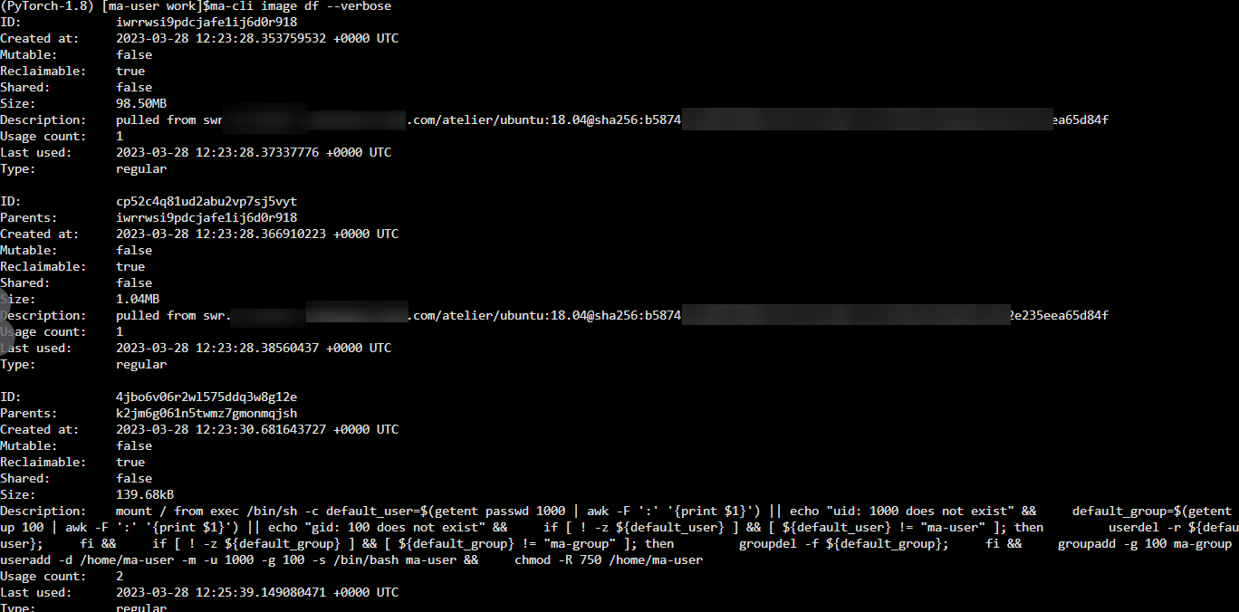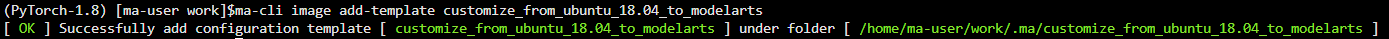 ma-cli image命令支持:查询用户已注册的镜像、查询/加载镜像构建模板、Dockerfile镜像构建、查询/清理镜像构建缓存、注册/取消注册镜像、调试镜像是否可以在Notebook中使用等。具体命令及功能可执行ma-cli image -h命令查看。