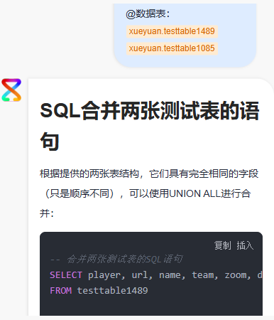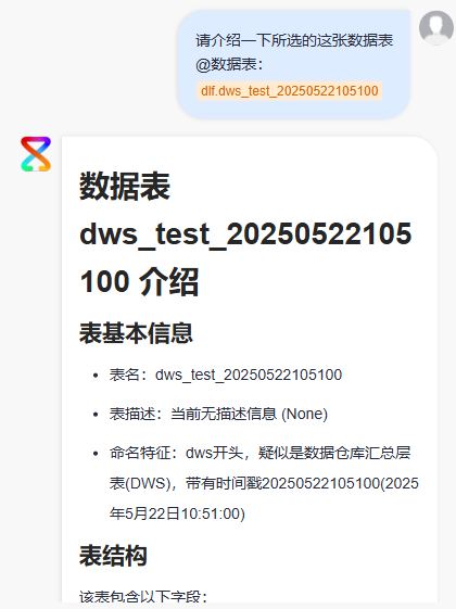 - 如下图所示,大模型的回答可以帮助用户了解表结构、核心业务字段等信息,用户可以利用问答信息对数据进行操作。