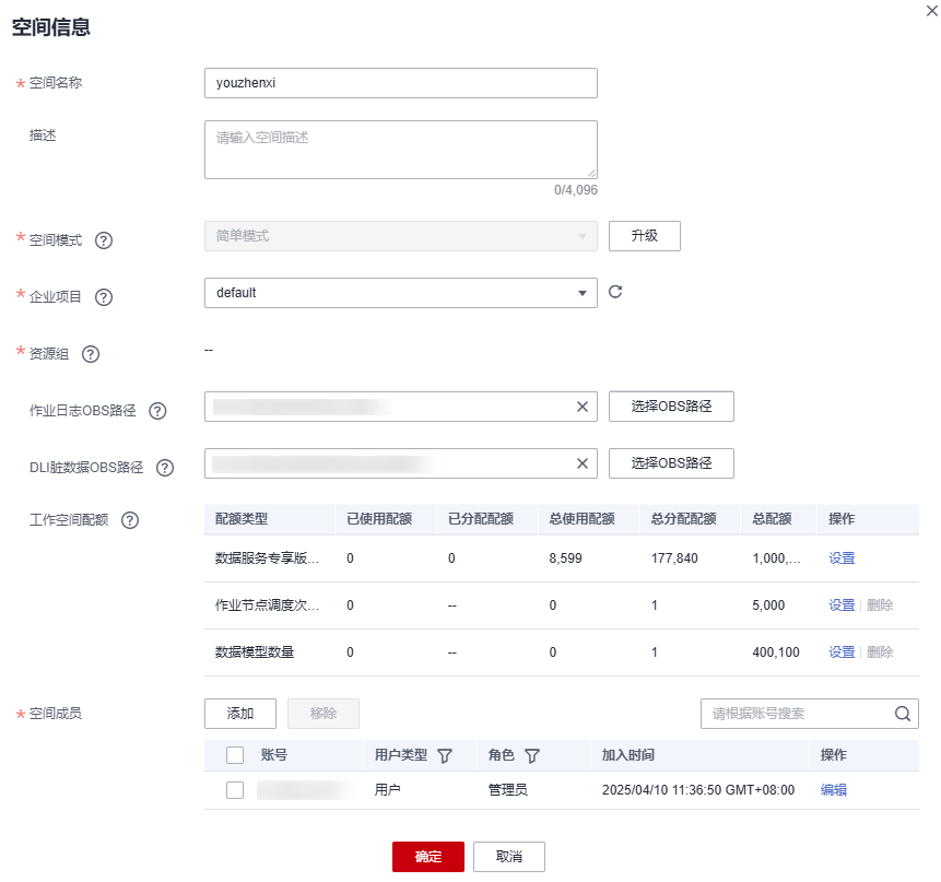 - 已使用配额:表示当前工作空间下已使用的配额,由系统自动统计。