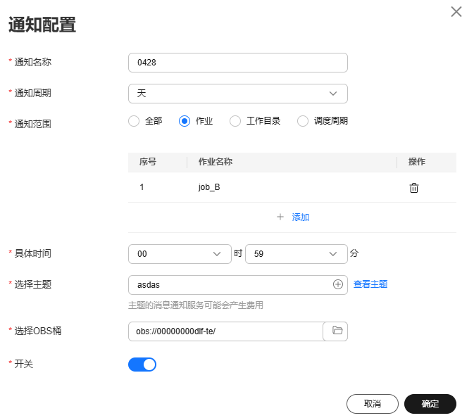 数据开发模块的通知管理功能是通过消息通知服务来发送消息,消息通知服务的使用可能会产生费用,具体请咨询消息通知服务。