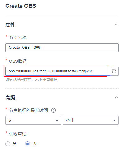 - 打开作业“test”,从左侧节点库中拖拽一个“Create OBS”节点。