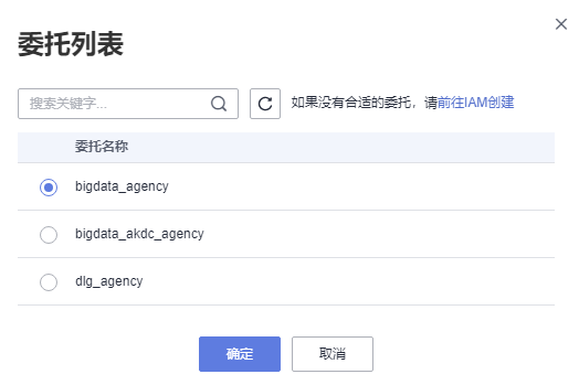 - 单击右边的“+”在委托列表中选择合适的委托,也可重新创建委托。创建委托和配置权限,请参见参考:创建委托和参考:配置委托权限。