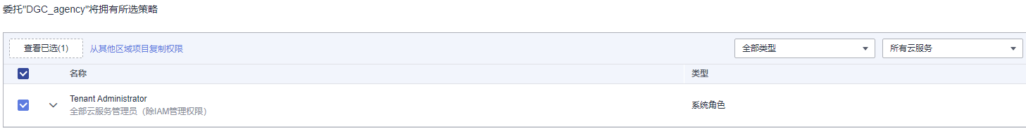 - 因Tenant Administrator策略具有除统一身份认证服务IAM外,其他所有服务的所有执行权限。所以给委托服务DataArts Studio配置Tenant Administrator,可访问周边所有服务。