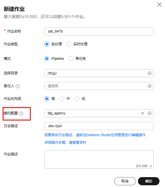 支持新建作业时,配置作业级委托。也支持修改已有作业的委托。
