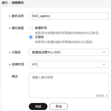 - 在创建委托页面,委托类型选择“云服务”,云服务选择“数据湖治理中心DGC”,将操作权限委托给DataArts Studio,让DataArts Studio以您的身份使用其他云服务,代替您进行一些资源运维工作。