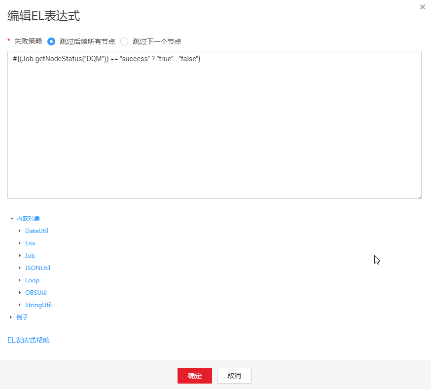 此Demo中使用的EL表达式为“#{Job.getNodeStatus("node_name")}”,这个表达式的作用为获取指定节点的执行状态,成功状态返回success,失败状态返回fail。本例使用中,IF条件表达式分别为:
