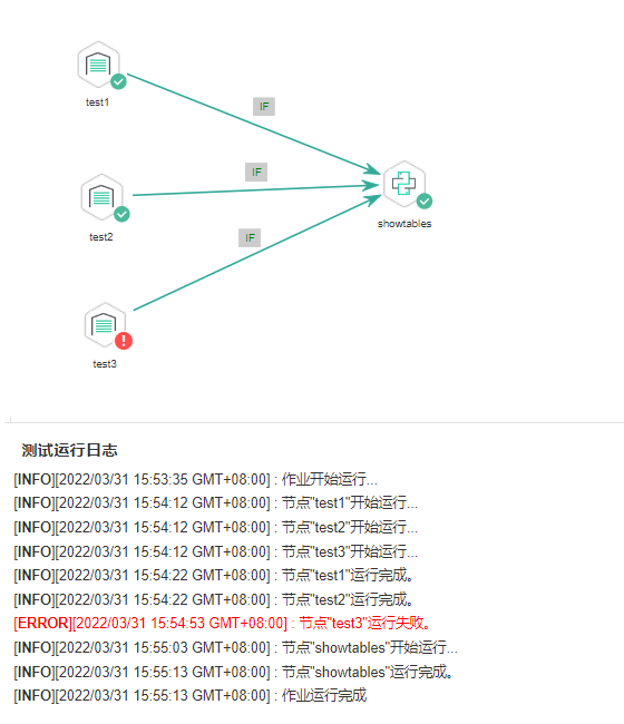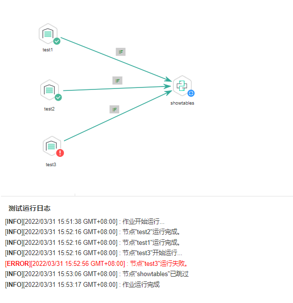 - test3节点IF条件表达式为:#{(Job.getNodeStatus("test3")) == "success" ? "true" : "false"},