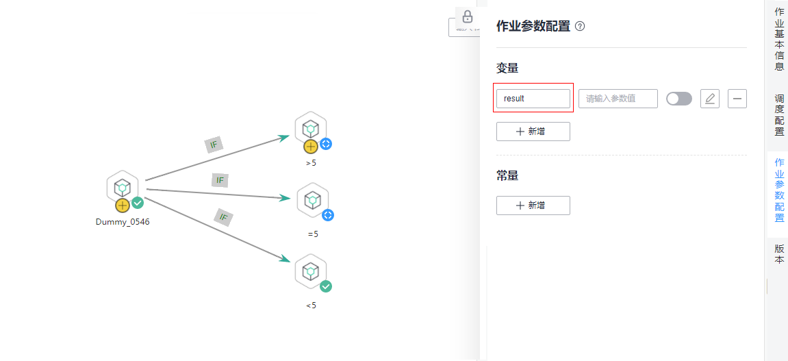 - 配置作业参数。此处需将参数名填写为result,仅用于主作业testif中的For Each节点识别子作业参数;参数值无需填写。