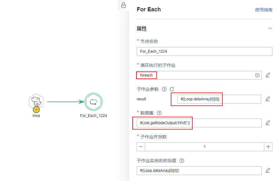 场景分析:由于HIVE SQL节点的Select语句执行结果为单字段的二维数组,因此为获取二维数组中的值,EL表达式#{Loop.dataArray[][]}或#{Loop.current[]}均可以实现,且当前只有For Each节点支持Loop表达式,所以HIVE SQL节点后面需要连接一个For Each节点。