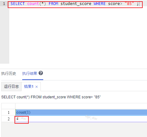 --从student_score表中统计成绩在85分以上的人数-- SELECT count(*) FROM student_score WHERE score> "85" ;