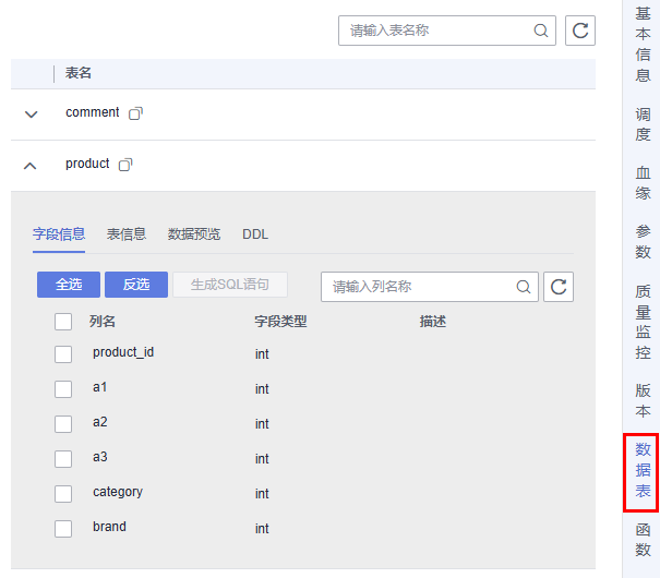 支持Hive SQL、Spark SQL、DLI SQL、DWS SQL、Doris SQL和RDS SQL单任务批处理作业可以查看右侧的数据表,单击表名前面的单选框,可以查看该数据的列名、字段类型和描述。