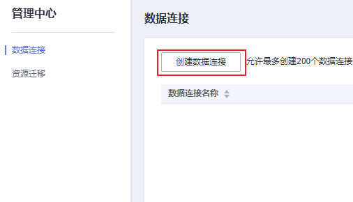 - 在管理中心页面,单击“数据连接”,进入数据连接页面并单击“创建数据连接”。