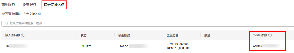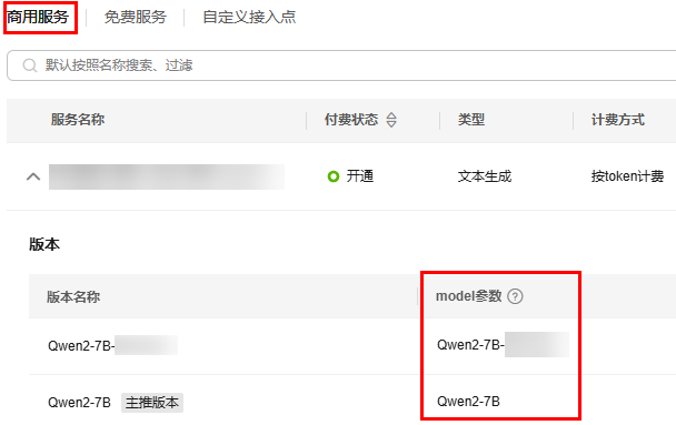 自定义接入点或者商用服务的model参数。获取方式如下: