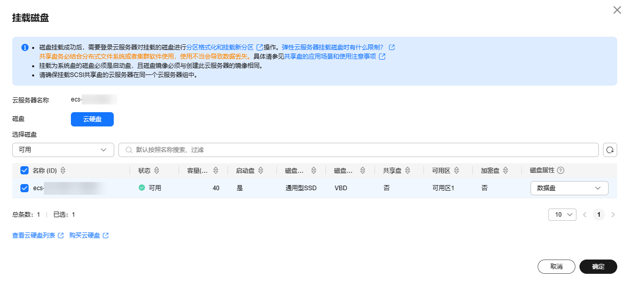 - 单击“挂载磁盘”,在“挂载磁盘”对话框中,选择步骤4中卸载的系统盘,将其挂载回原弹性云服务器上。