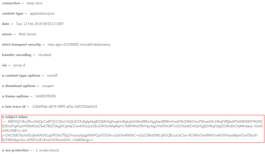 Figure 1 shows the response header fields for the API used to obtain a user token. The x-subject-token header field is the desired user token. This token can then be used to authenticate the calling of other APIs.