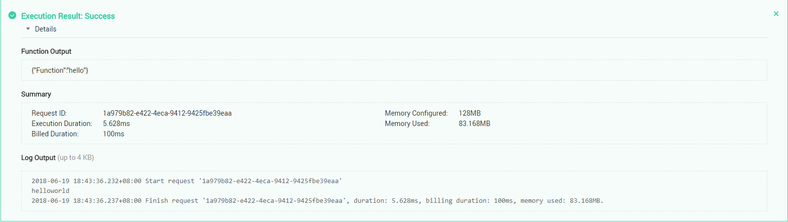 The function execution result consists of three parts: function output (returned by callback), summary, and logs (output by using the console.log or getLogger() method), as shown in Figure 5.