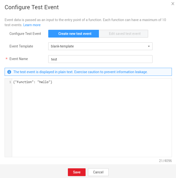 On the function details page that is displayed, choose Select test event > Configure test event. Configure the test event information, as shown in Figure 4, and then click Save.