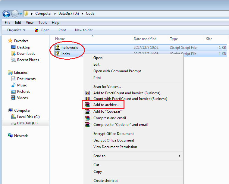 In this example, the function project files are saved under the ~/Code/ directory. Select and package all files under the directory to ensure that the index.js file, the handler of your FunctionGraph function, is under the root directory when the ZIP file is decompressed.