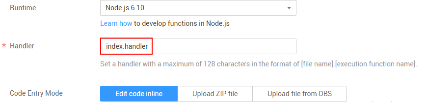 The function handler is in the format of [File name].[Function name]. For example, if you set the handler to index.handler in your function, as shown in Figure 1, FunctionGraph will load the handler function defined in the index.js file.
