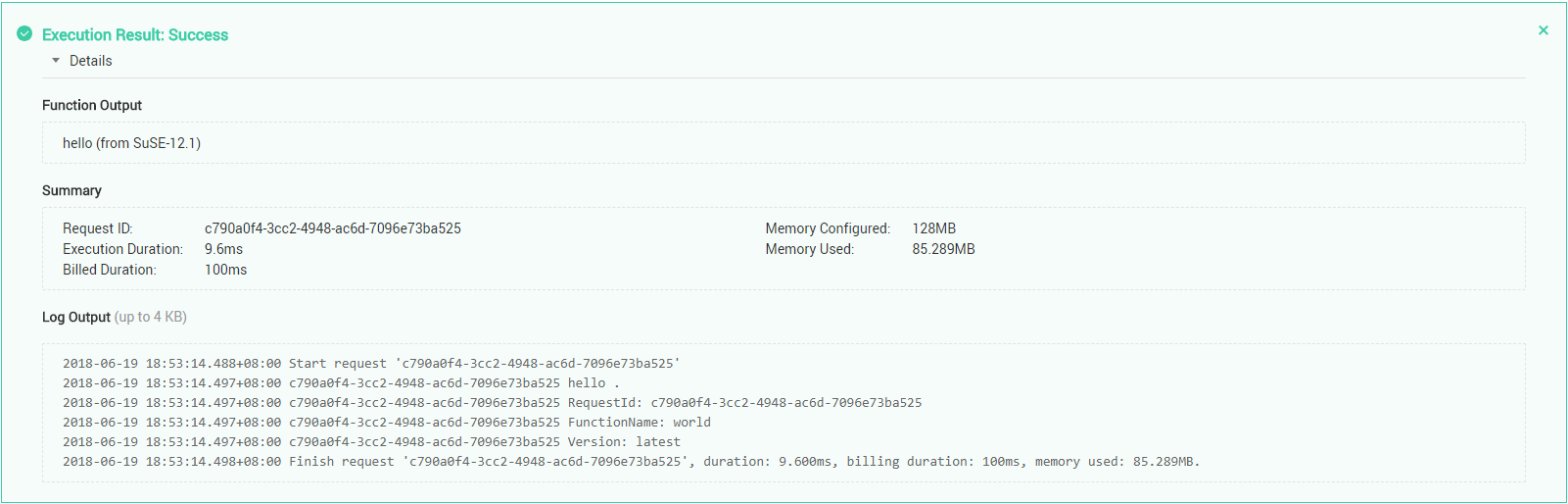 The function execution result consists of three parts: function output (returned by callback), summary, and logs (output by using the console.log or getLogger() method), as shown in Figure 3.