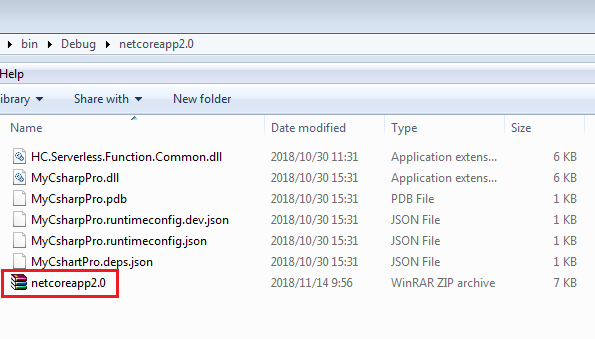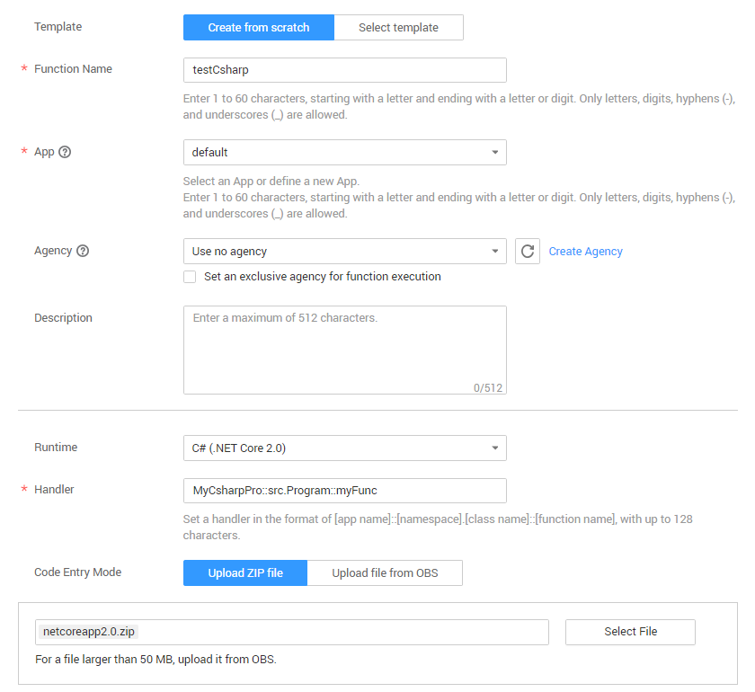 root@SZX1000371099:/home/fsscsharp/src/MyCsharpPro# vi MyCsharpPro.csproj root@SZX1000371099:/home/fsscsharp/src/MyCsharpPro# dotnet build Microsoft (R) Build Engine version 15.7.179.6572 for .NET Core Copyright (C) Microsoft Corporation. All rights reserved. Restore completed in 54.28 ms for /home/fsscsharp/src/MyCsharpPro/MyCsharpPro.csproj. MyCsharpPro -> /home/fsscsharp/src/MyCsharpPro/bin/Debug/netcoreapp2.0/MyCsharpPro.dll Build succeeded. 0 Warning(s) 0 Error(s) Time Elapsed 00:00:01.47 - Deploy the C# project to FunctionGraph.