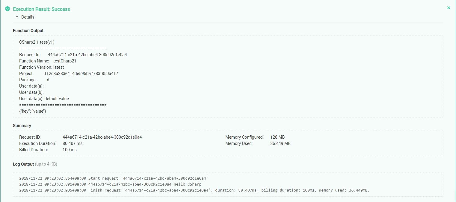 Function logs are printed. A maximum of 4 KB logs can be displayed. |