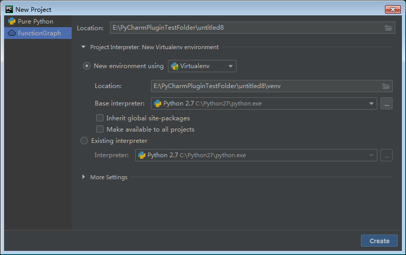 - Select the path in which the project will be stored in Location, and select a Python version in Base interpreter, as shown in Figure 6.