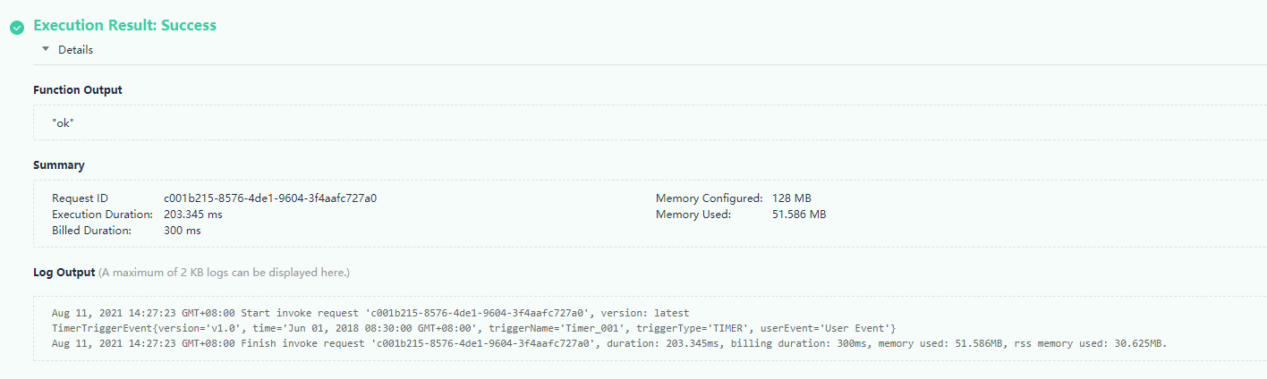 The function execution result consists of three parts: function output (returned by callback), summary, and log (output by using the console.log or getLogger() method), as shown in Figure 12.