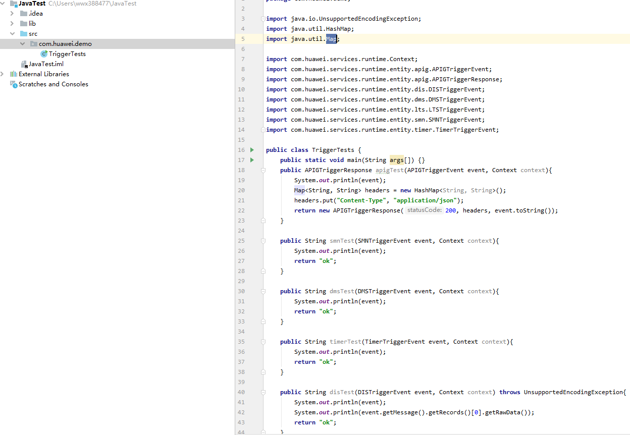 - Create a package named com.huawei.demo, and then create a class named TriggerTests under the package, as shown in Figure 4.